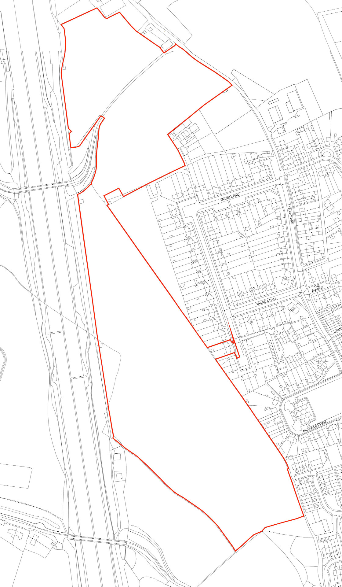 The site is on the western edge of Redbourn and covers 14.9 hectares currently in arable use. The site is bordered by the M1 to the west and Tassell Hall to the east, with the northern section extending east to Lybury Lane, to the south lies Flamsteadbury Park.