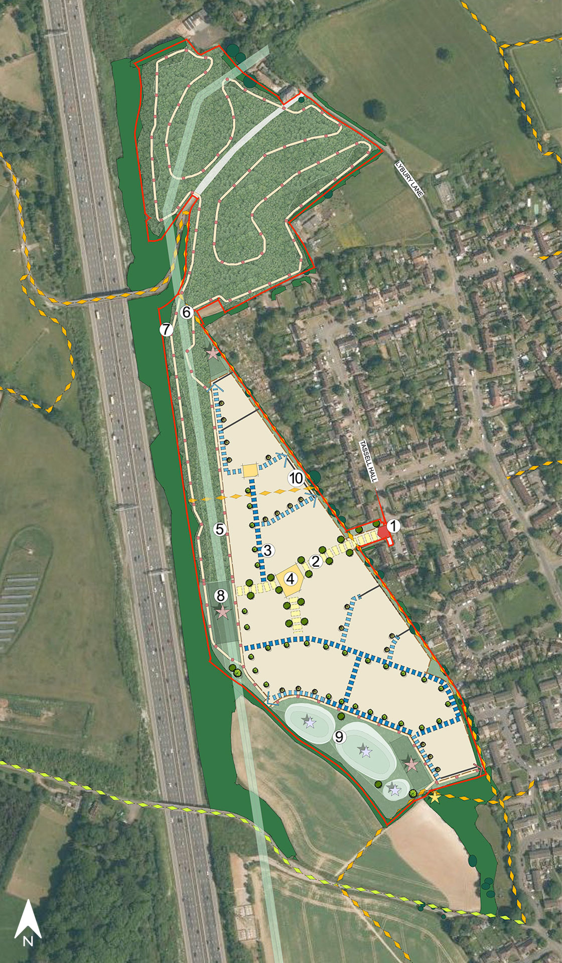 A Suitable Alternative Natural Greenspace (SANG) is proposed, created from a mix of native broadleaved woodland and mixed scrub as mitigation for recreational impacts to Chiltern Beechwoods Special Areas of Conservation (SAC). The SANG will not only be attractive to local residents for recreational use, but will strengthen the west ecological corridor and provide more habitat for several species groups.